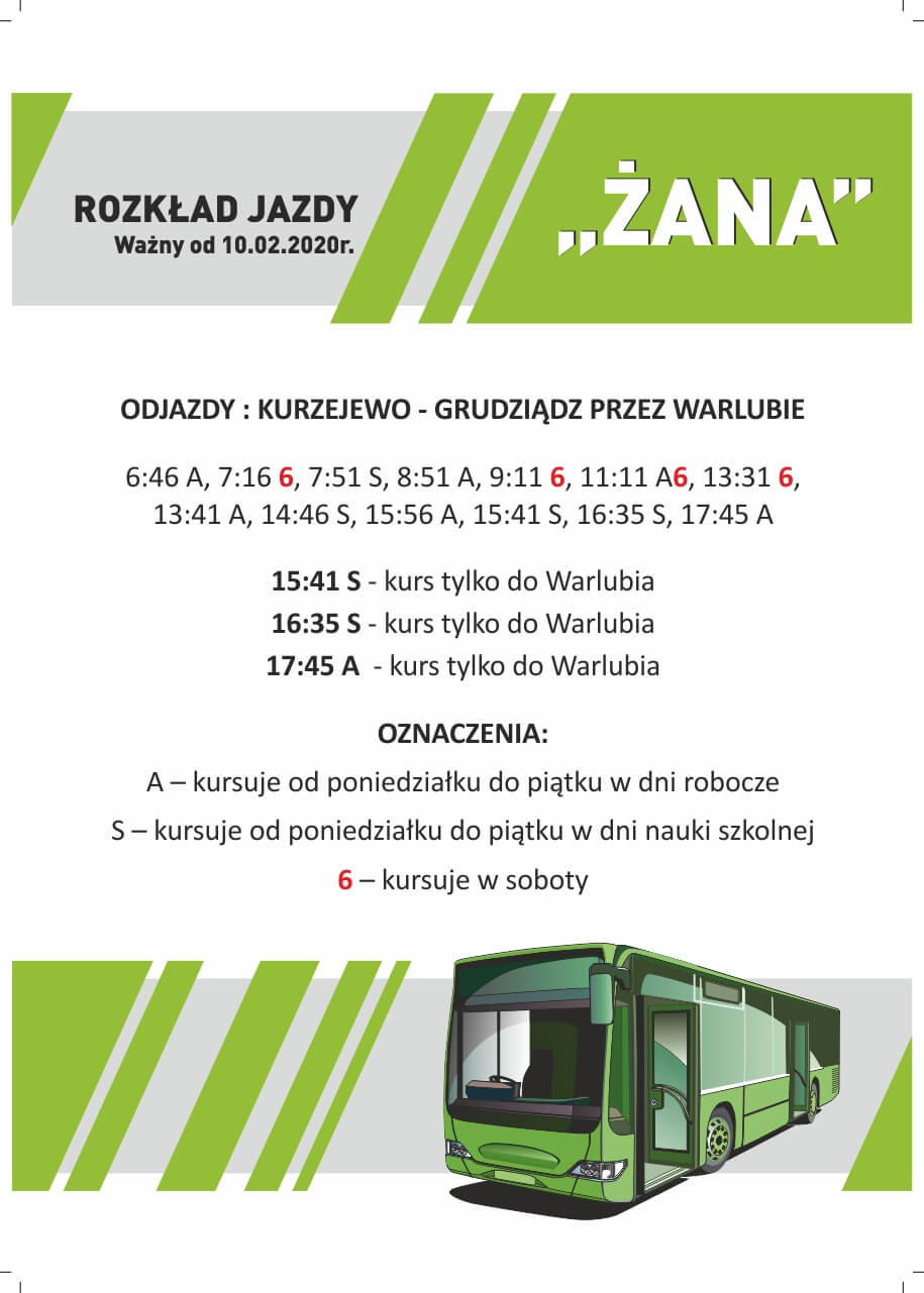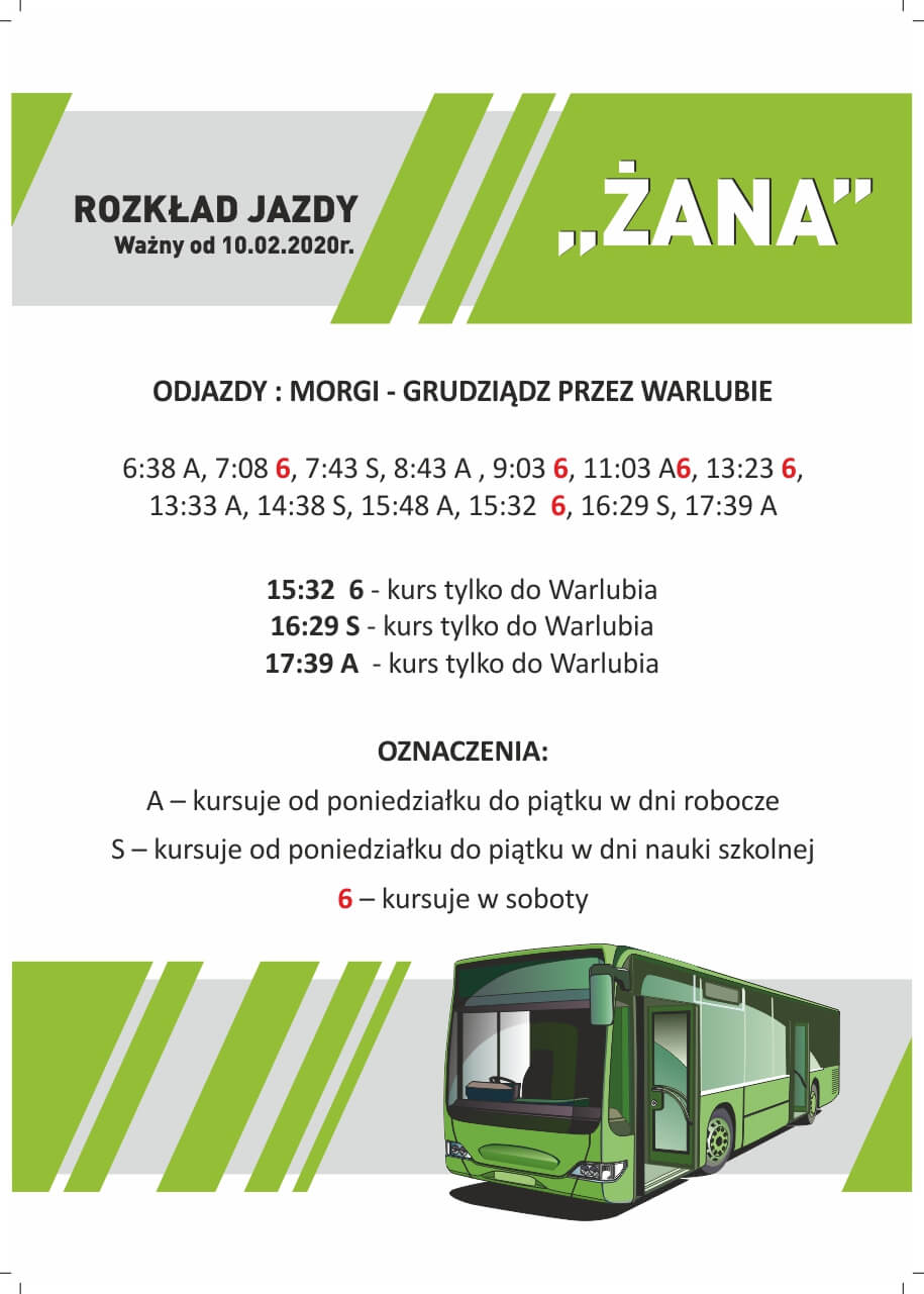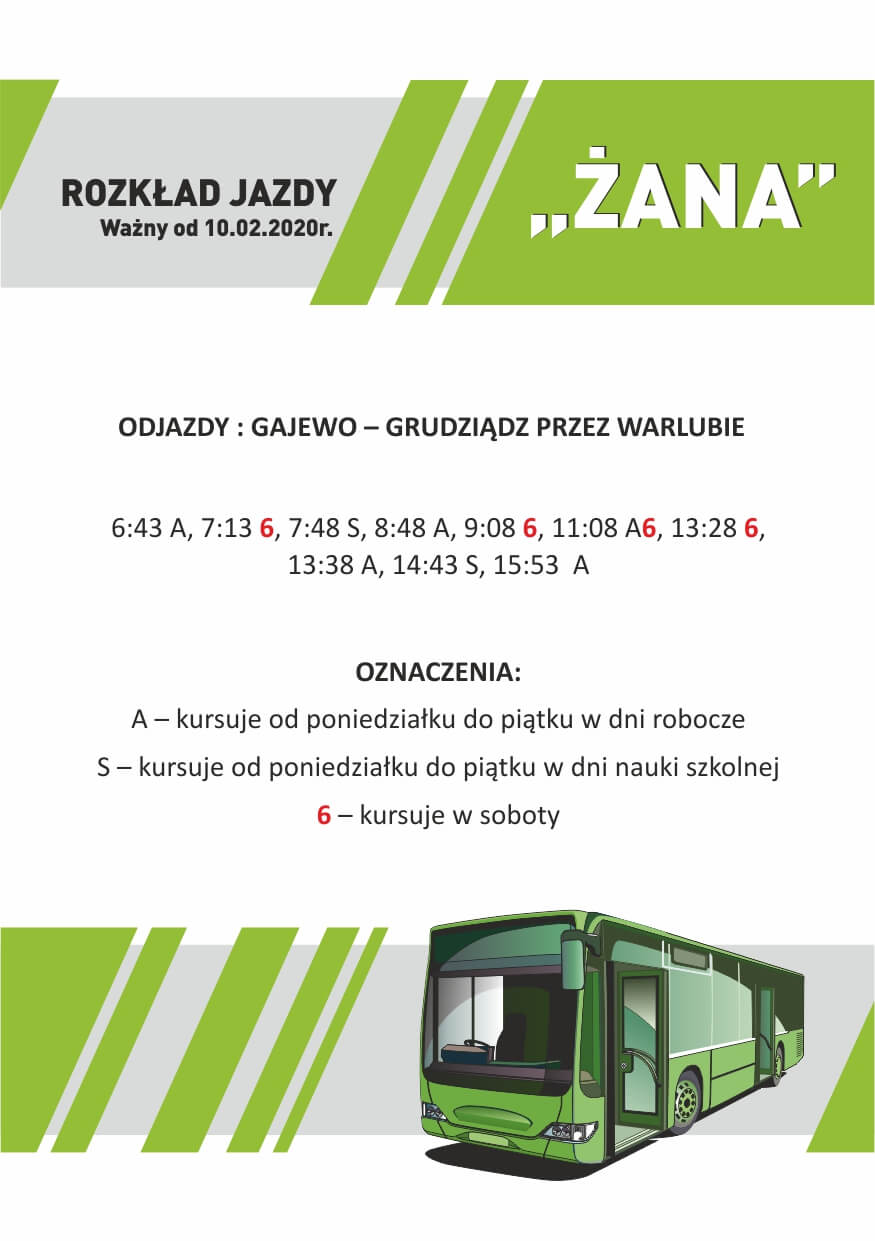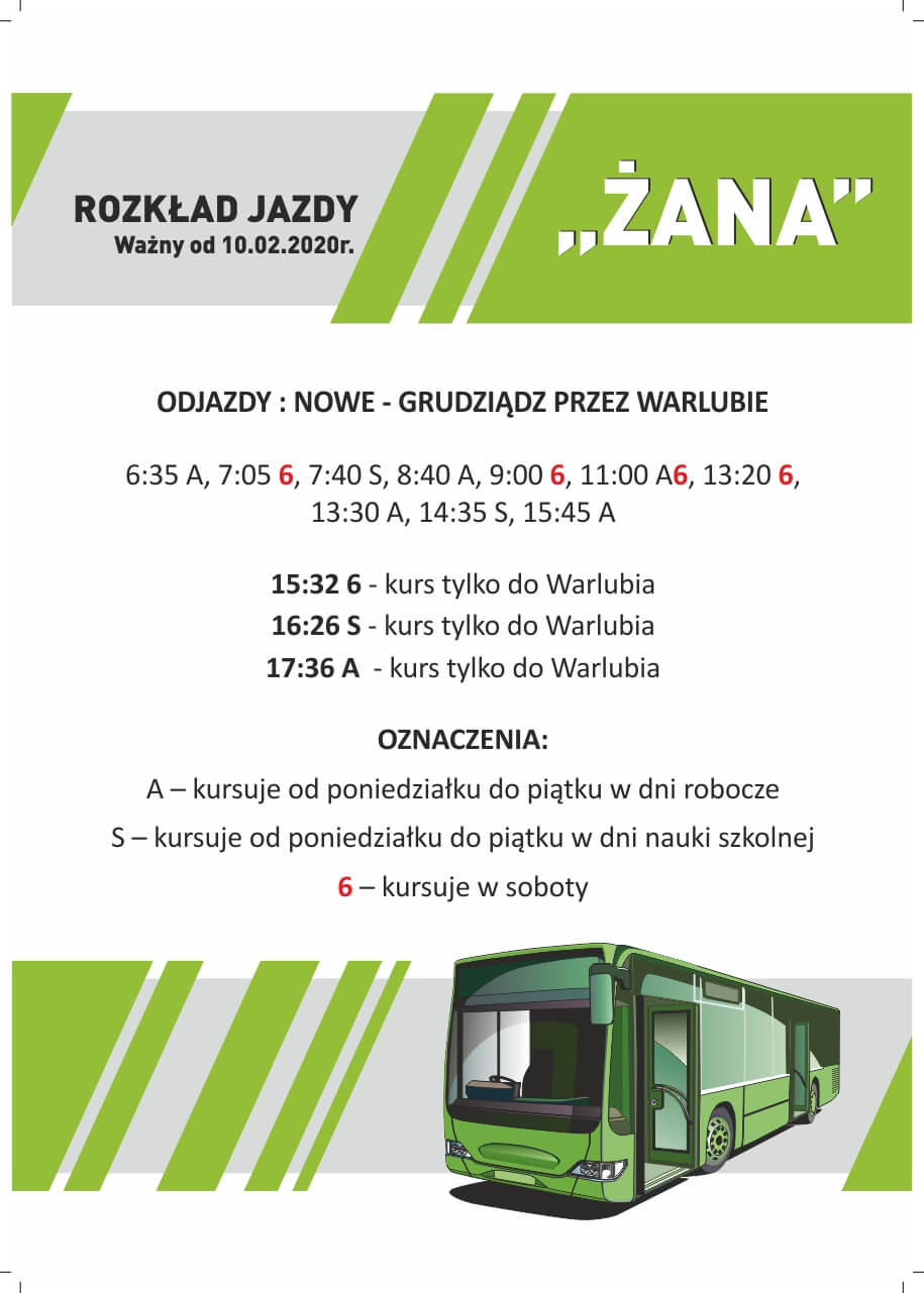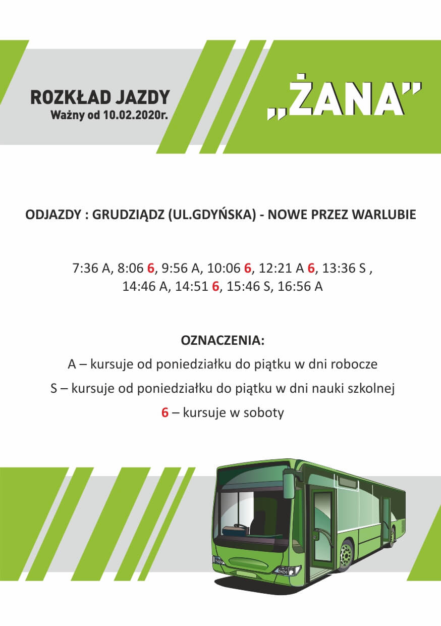 Autobusy ŻANA zatrzymują się na przystankach: Grudziądz ul. Focha, Grudziądz ul. Gdyńska, Dragacz, Dolna Grupa, Fletnowo I, Fletnowo II, Bzowo, Warlubie d.k., Kurzejewo, Zdrojewo, Gajewo, Trzy Korony, Morgi, Nowe d.k.