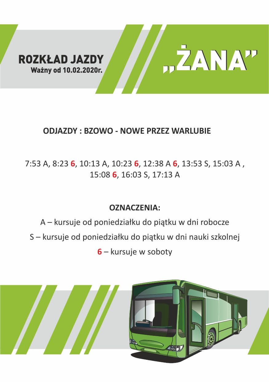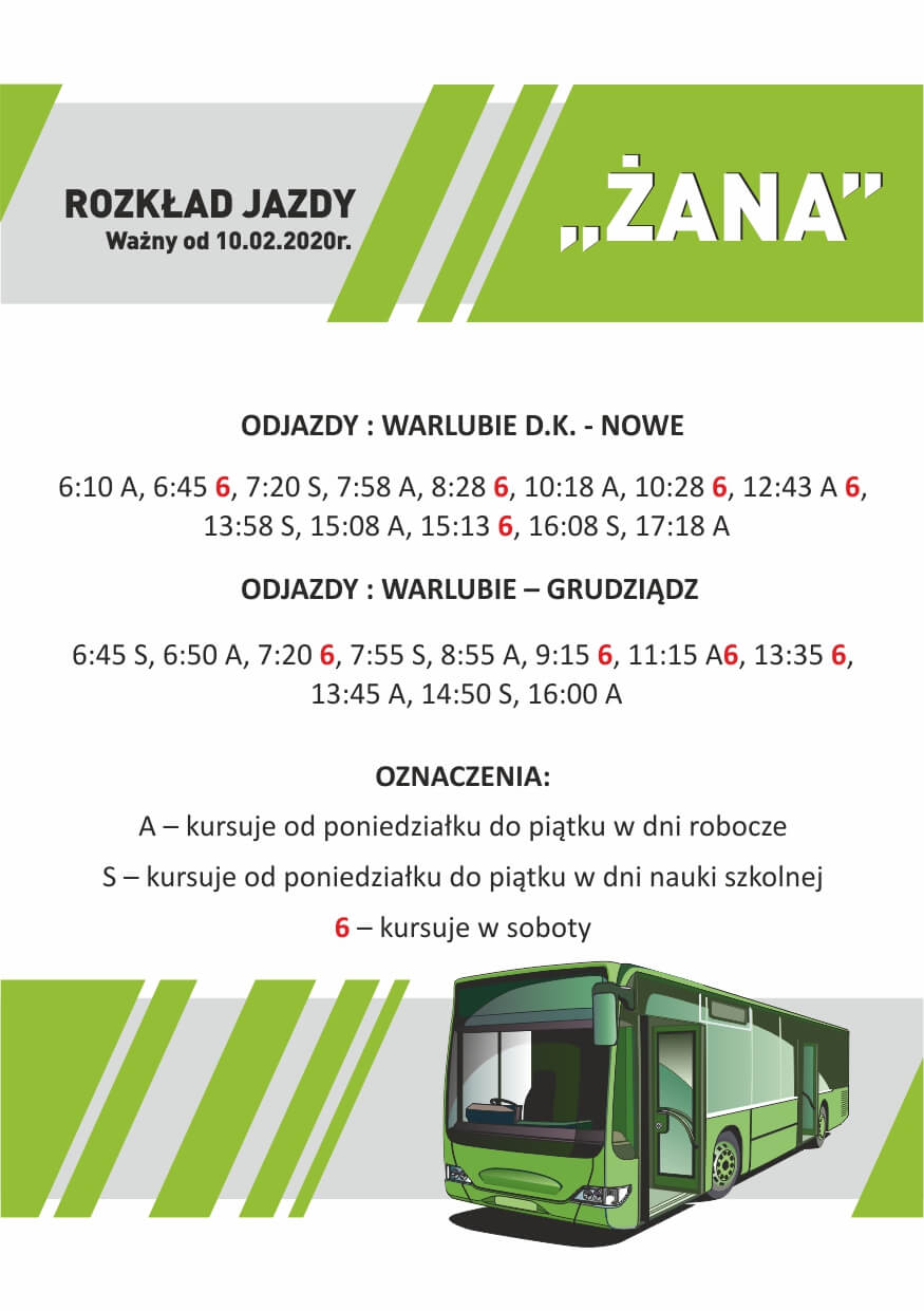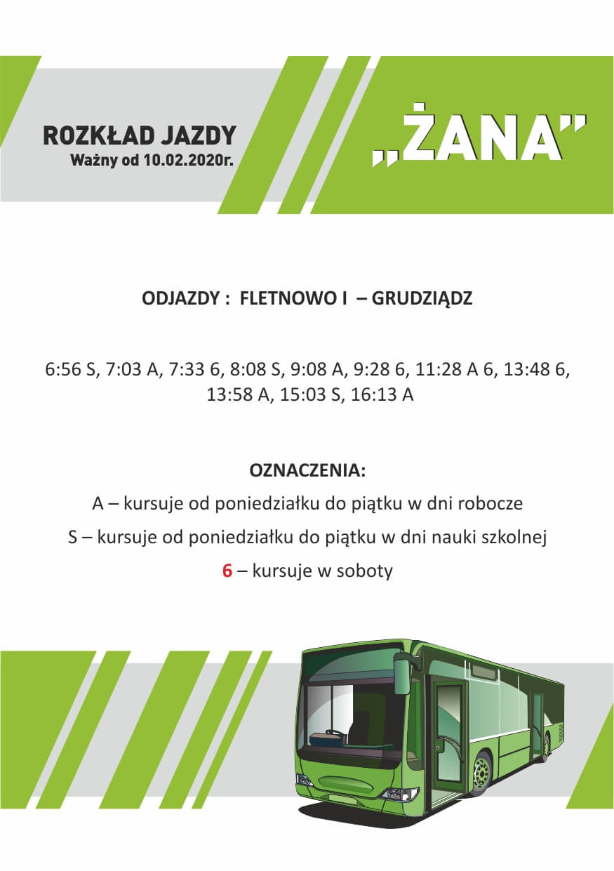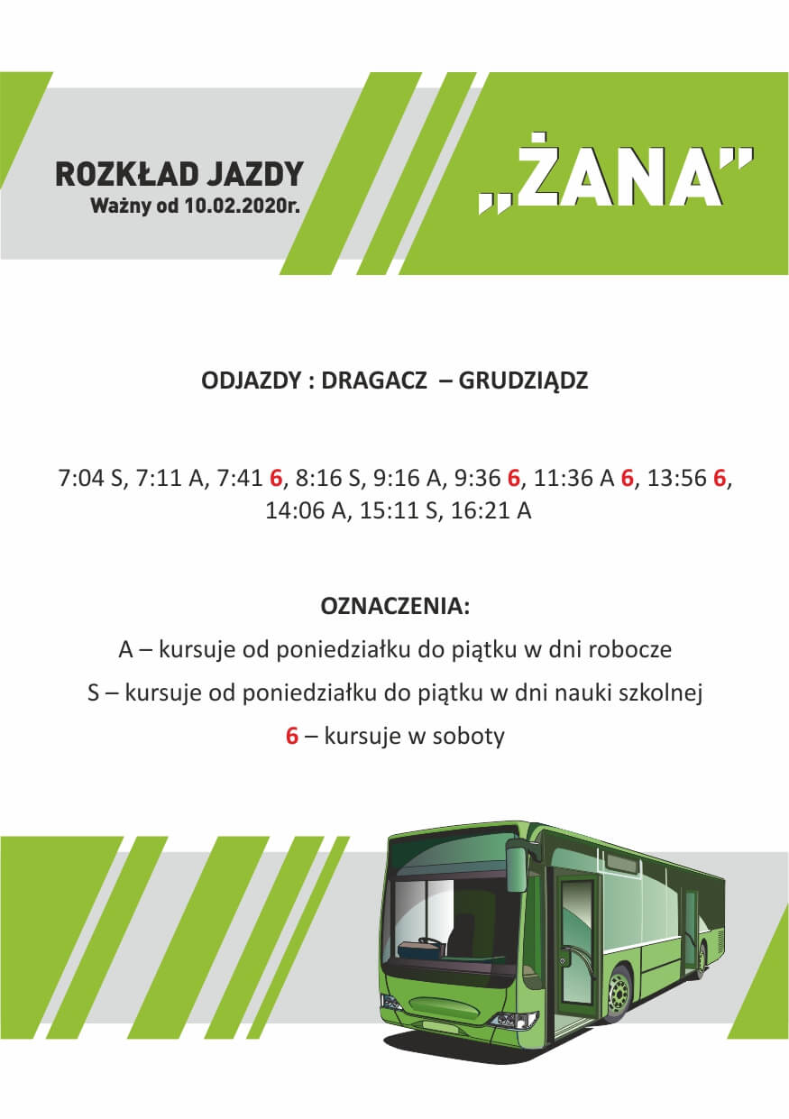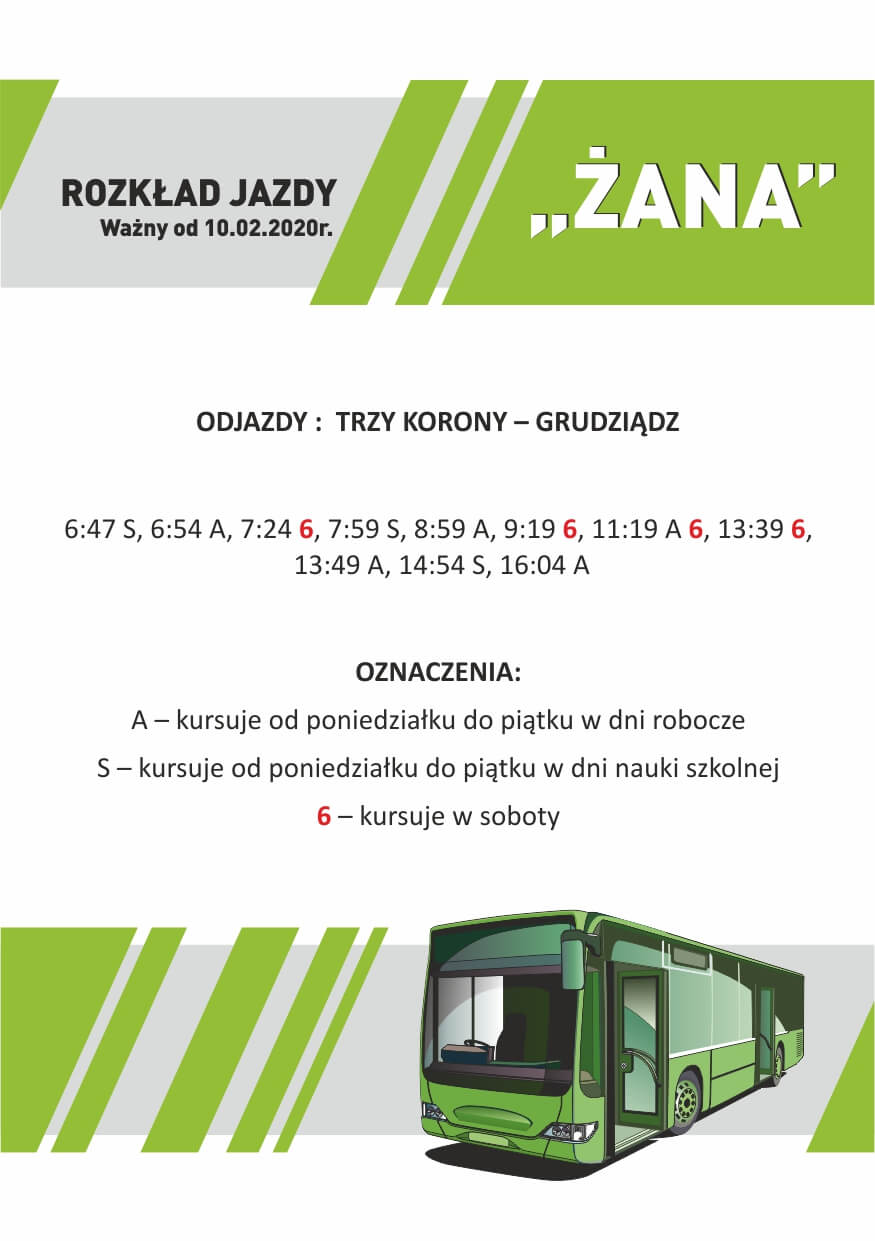 Autobusy ŻANA zatrzymują się na przystankach: Grudziądz ul. Focha, Grudziądz ul. Gdyńska, Dragacz, Dolna Grupa, Fletnowo I, Fletnowo II, Bzowo, Warlubie d.k., Kurzejewo, Zdrojewo, Gajewo, Trzy Korony, Morgi, Nowe d.k.